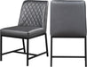 Give your dining room a revamp with this Bryce Faux Leather Dining Chair from Meridian Furniture. This handsome chair features an armless design with heavily padded seat and back cushions, ensuring that guests stay comfortable all the way through dessert. The back is quilted for added aesthetic appeal, and it's upholstered in grey faux leather for the luxury look of leather without the maintenance requirements. A metal frame and matte black metal legs complete the look and provide sturdy support.
